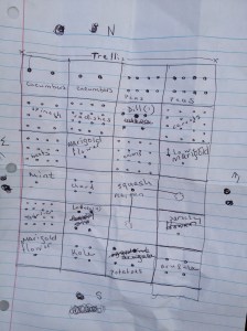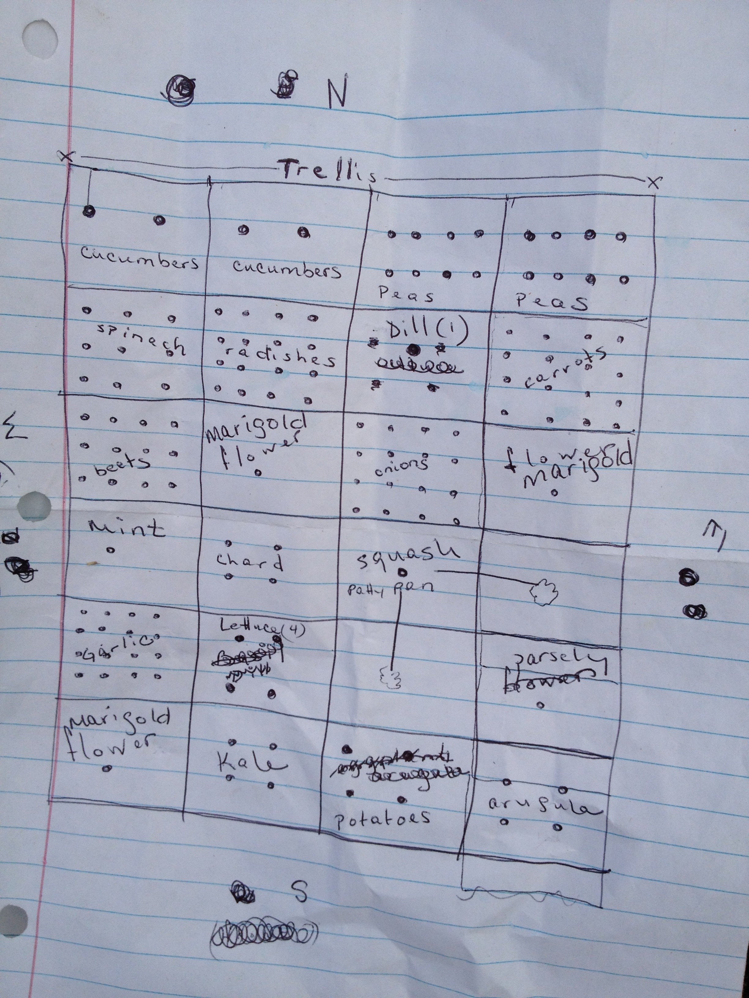 Amazingly, our little plot is home to approximately 85 plants, some of which will mature quickly and be re-seeded or rotated out and replaced with something else; others will take until fall to fully ripen. So far we have sugar snap peas, beets, rainbow swiss chard, onions, spinach, spearmint, basil, cucumbers, yellow straight-neck squash, lettuce mix, garlic, and fennel-leaf dill. Plus some marigolds to repel nematodes, squash bugs, and whiteflies.